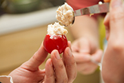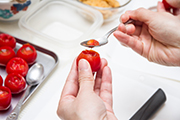 | 3 | ミニトマトはヘタを取ってから、置いて座りのよい方を下にし、上部を切り落とし種を取り除きます。![]() くり抜いたトマトに(2)を詰めて、切り落とした部分でフタをします。 ![]() 種は刻んで残りの(2)に混ぜ合わせます。 ![]() ※ミニトマトは、円形で座りのいい、果肉のしっかりしたものがおすすめです。 トマトには、刻んだ種は詰めません。 |