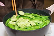 | 4 | 豆類は、筋のあるものは筋を取り、固いものから順に塩ゆでし、ザルにあげておきます。 セロリは筋を取り、棒状に切ります。 ![]() ※いずれの豆もあまりゆですぎないようにしてください。空豆は長くても3分が目安です。 |