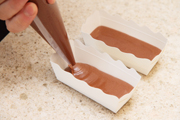 | 4 | マロンマスカルポーネクリーム マスカルポーネとマロンクリームを混ぜ合わせ、お好みでラム酒少々を加えます。お好みの口金を付けた絞り袋にクリームを詰め、冷めたチョコレートカップケーキの上に絞り、栗の渋皮煮や金箔を飾ります。 |