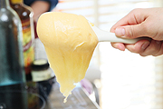 | 3 | ヘラから生地を落とすときにゆっくり三角形になれば、卵を加えるのをやめます。 (ヘラを横に向けて生地が落ちる形(三角形)を見ます。後半は少しづつ卵を加えていきます。) ![]() |