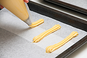 | 4 | (3) の生地が温かいうちに絞り袋に入れ、2㎝太さ11㎝に絞ります。![]() 表面にきりふきをかけ、(1) をのせます。 ![]() 200℃に温めたオーブンで8分、そのまま180℃に落として20分焼きます。 (口金はあれば星形、なければ丸型でもよい。) |