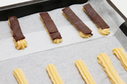 カリッとしたエクレア生地にチョコレートクリームを絞り込みます。