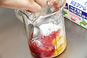 | 1 | ソースを作ります。深めの耐熱容器に、冷凍ラズベリー、皮を剥き細かく切ったオレンジ、砂糖を入れ、電子レンジで600Wで1分加熱します。ラズベリーをつぶして、![]() 更に1分加熱します。粗熱を取って、冷蔵庫で保存します。 (電子レンジから取り出すときは、火傷に注意してください。) |