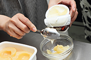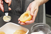 | 2 | 桃の内側のくぼみを、スプーンで削ります。![]() 削った果肉を小さめの容器に入れて、つぶし、サワークリームと混ぜます。 ![]() 出来たクリームを桃の内側に流し込み、冷蔵庫に入れておきます。 |