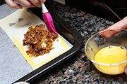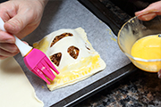 | 5 | フォーク等で端をおさえ閉じ、オーブン皿にのせます。表面に卵黄水を塗り、ナイフの先で数カ所、穴をあけます。![]() ![]() |
