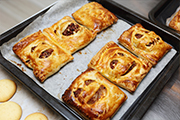 | パイシートは解凍しすぎないようにしてください。柔らかくなりすぎると包みにくいです。炒めたフィリングは、必ず冷めてから包みましょう。 出来れば焼きたて熱々を召し上がれ。 |