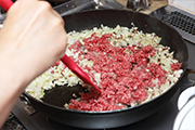 | 1 | かぼちゃは1㎝角に切り、ラップに包んで600Wの電子レンジに2分かけ柔らかくし冷ましておきます。フライパンにバターとオリーブ油を入れ、玉ねぎを最初に炒め、しんなりしたら合い挽き肉、椎茸を加えて炒めます。![]() ![]() |