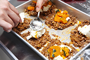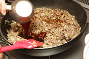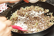 | 2 | ひき肉の色が変わったら薄力粉を加えて更に炒め、Aの調味料を加えます。![]() ![]() 水分が飛んでトロリとなるまで炒めたら、塩、こしょうで味をととのえ、火を止め冷まします。4等分にし、それぞれにかぼちゃとクリームチーズをのせます。 ![]() (クリームチーズは一口サイズになるようにスプーン等で取り出して加えます。) |
