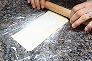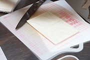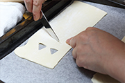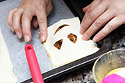 | 3 | パイシート2枚をそれぞれ半分にします。1枚ずつ長さが倍になるようにめん棒で長方形に伸ばします。![]() ![]() (顔を作る場合はナイフで目の部分を切り取り、口の部分の切り込みを入れます。) ![]() |