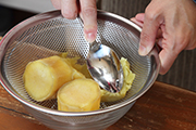 | 1 | さつまいもは蒸して、トッピング用(1㎝厚さの輪切り)を取っておき、残りは温かいうちに皮をむきペースト状にします。 (マッシャーや目の粗いザルを使うと簡単です。) ![]() |