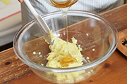| 2 | (1)のペーストにはちみつを加えて混ぜ、冷めたらフロマージュブランを混ぜ合わせます。![]() ![]() (さつまいもの甘さによって、はちみつの量を加減してください。) |
