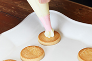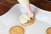 | 5 | クッキーに(4)を絞り出します。 (中心からスタートしてクッキーの輪郭に沿って絞り出し、渦を描くように上に向かって細く仕上げます。) ![]() ![]() |