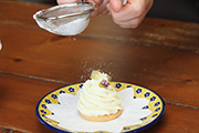 | 6 | (1)で取っておいた、トッピング用のさつまいもを小さく切って(5)にのせて、粉砂糖を茶こしに入れてふります。![]() |