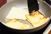 | 2 | フライパンにバター大さじ1を入れ弱火にし、(1)を両面に薄く焼き色がつくまで焼きます。 残りのパンも同様に焼き、冷ましておきます。 ![]() (焼くときは焦げやすいので弱火でゆっくり焼きましょう。) |