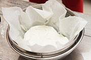 | 1 | ボウルにクッキングシートを敷き、ヨーグルトを入れて水を切ります。 1時間後くらいから使用できますが、時間がある時は一晩置くとさらに濃厚になります。お好みで調節してください。 (大さじ3のヨーグルトが、水切り後に大さじ2になるくらいの濃度がおすすめです。) |