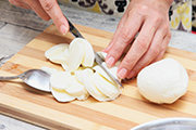 | 4 | モッツァレラは、加熱しやすいように1cm幅にスライスします。![]() ![]() |