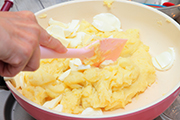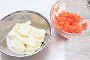 | 1 | 明太子の皮を取り除きます。 (明太子がなくても塩、こしょうで調整すればいただけますが、明太子を入れるとピンク色でかわいくなります。) |