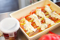 | 5 | ディルクリームの上にじゃがいもとサーモンを互い違いに並べ、残りのディルクリームを上にのせ、チーズを散らします。![]() |