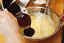 | 8 | メレンゲが見えなくなるまで混ぜたら、型に流し入れ、180℃に予熱したオーブンで30~40分焼きます。 (メレンゲ投入後、生地は混ぜすぎないようにします。型の高さの7-8割ほどの高さまで生地を入れます。) ![]() |
