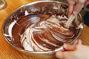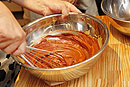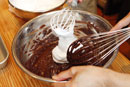 | 2 | 別のボウルにチョコレートを入れ、湯せんで溶かします。そこに湯せんで溶かしたバターを3回に分けて加え、その都度よく混ぜます。 (バターは湯せんで熱めに溶かしておきます) ![]() |