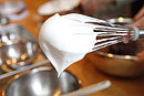 | 5 | 泡だて器を持ち上げ、ツノが立ったら、ハンドミキサーを低速にし、泡の粒子を均一にします。最後は泡だて器に持ち替えてたたきこむようにしてしっかりとしたメレンゲに仕上げます。表面がつややかになったらできあがりです。![]() しっかりとしたメレンゲを作ることがショコラクラシックの仕上がりのよさのポイントです。 すばやくつややかで弾力のあるメレンゲを作りましょう! |