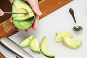 | 1 | アボカドは、縦半分に切って種を取り出し、縦に1周切り目を入れて開き、包丁の角を種に刺して取り除きます。 果肉の回りに包丁を入れ、皮を傷つけないように果肉を取り出します。 ![]() ![]() |