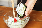 | 2 | (1)の果肉を1㎝角に切ってフロマージュブランと混ぜ合わせます。![]() |