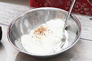 | 2 | ボウルに水切りヨーグルト、塩、こしょうを入れ攪拌し、ソースを作ります。![]() ![]() |