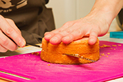 | 4 | 型に軽くショートニング(分量外。サラダ油でも可)を塗り、紙をしいて生地を流し170℃に予熱したオーブンで28分焼き、焼きあがったら逆さまにし、網にのせて冷まします。 (生地を焼くときは少し真ん中を低めにします。) ![]() ![]() |