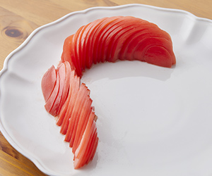 | 2 | トマトは縦半分に切ってヘタを取り、断面を下にして置き、縦に厚さ3㎜の薄切りにします。 |